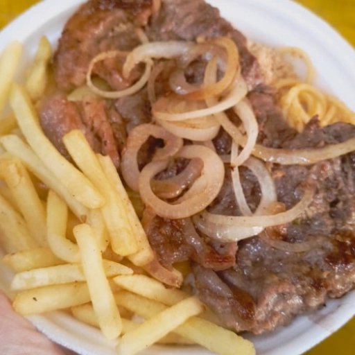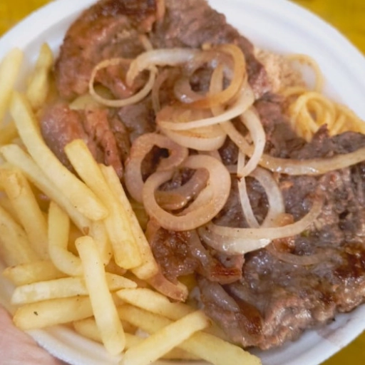Churrasco misto, batata frita, sem parar de frango, azeitona, ovo de codorna.