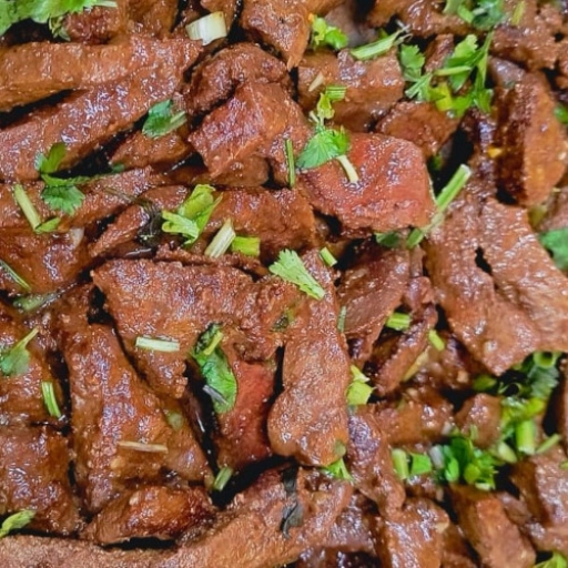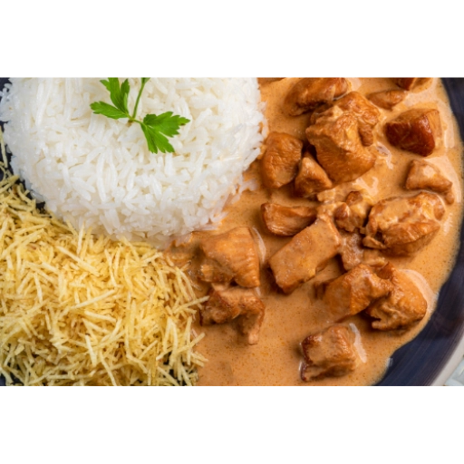 Frango a Passarinho, batata frita, alho frito e salsa.