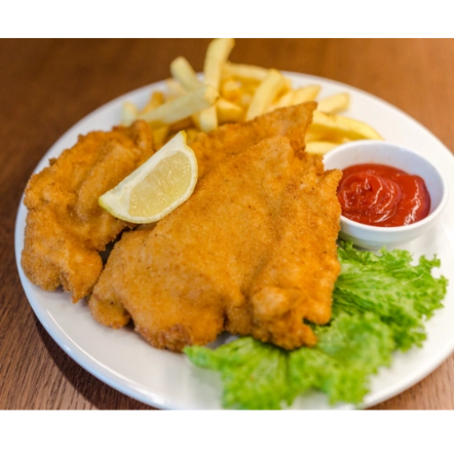 Gorjão de Peixe com molho rosê, batata frita e limão.