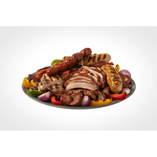 Churrasco misto, batata frita, sem parar de frango, azeitona, ovo de codorna